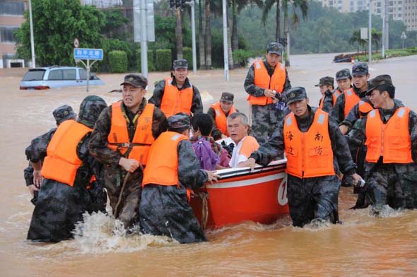 連日暴雨使海南文昌市區一片汪洋,海南省軍區官兵出動千余官兵奮力救災。圖為官兵從洪水中轉移被困群眾。肖雙劍 攝
