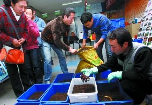 昨日,在東四七條居委會,前來領蚯蚓的居民圍在11個塑料儲物箱邊,民間環保組織地球村的工作人員張強戴著手套,一邊給每一只箱子配泥土和定量的蚯蚓,一邊給大家講解養殖蚯蚓的事項,“菜葉、果皮薄薄鋪一層即可,一天不要超過一公斤,最后用土蓋上”。