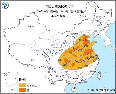 中央氣象臺10月20日06時繼續發布大霧藍色預警: