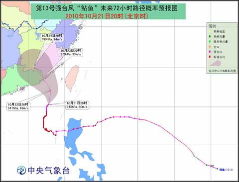 今年第13號(hào)強(qiáng)臺(tái)風(fēng)"鲇魚(yú)"的中心10月21日18時(shí)位于廣東省惠來(lái)縣南偏東約330公里的南海北部海面上,就是北緯20.1度,東經(jīng)117.6度,中心附近最大風(fēng)力有15級(jí)(50米/秒),最低氣壓為945百帕。