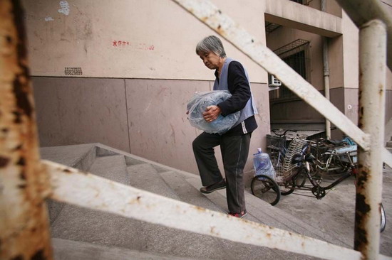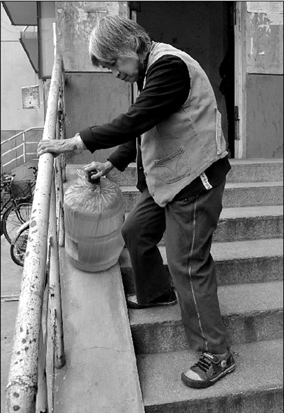 因為桶太沉,老太太將水桶順著樓梯的斜坡滑下來。記者 胡雪柏 攝