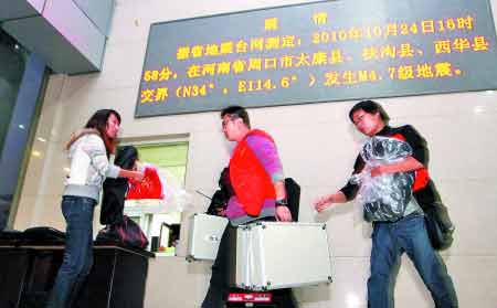 省地震局工作人員緊急出發趕赴震區。 記者 洪波 圖