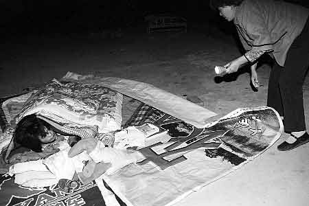 板橋鎮大街上,有村民在室外鋪起了床鋪。首席記者張鴻飛圖