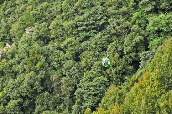 據風景區的工作人員介紹,救護小纜車有點像一個沒有頂的“籃子”,用一根繩索掛在纜繩上,靠坐在“籃子”里的技工手工操作來控制速度。為了保險,這名技工身上也有一根保險扣,扣在纜繩上。