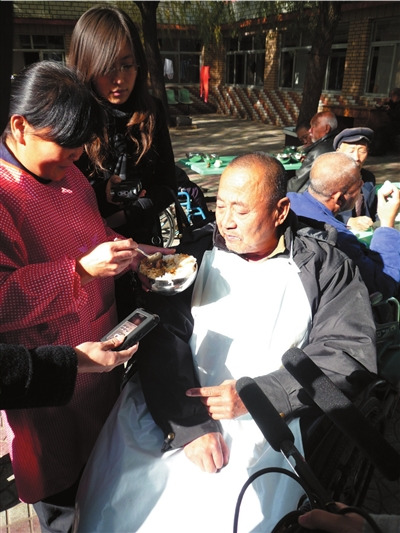 孫萬祥生活不能自理,吃飯需要護工照顧。 記者王麗娜攝