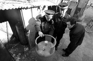西城城管監察大隊隊員正在對一家餐館的煤氣罐進行檢查。這是城管第一次涉及燃氣檢查。資料圖片 楊杰 攝