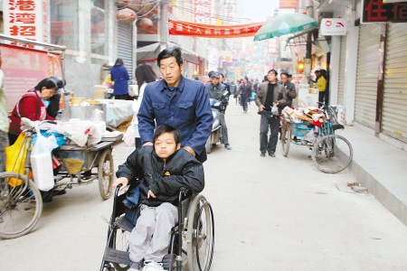 李存良推著兒子前往學(xué)校。(記者劉珂 實(shí)習(xí)生趙曉龍/攝)