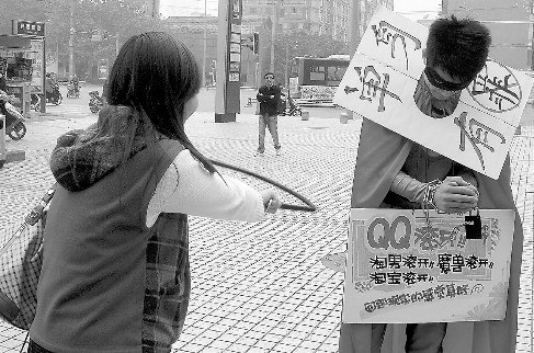 昨日下午2時許,SM廣場出現了一名奇怪的年輕男子,他身穿一件超人服,帶著蝙蝠俠式的眼罩,拿著皮鞭的雙手被鐵鏈鎖住。他的雙手掛著一個牌子,上面寫著“QQ滾開!淘男滾開!淘寶滾開!回到現實感覺真好!”等字樣,而脖子上的牌子寫著“單身有罪”。