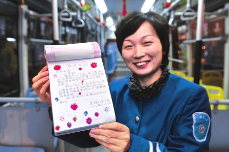 如今,“卡通公交”上掛起了留言簿,司機鐘雪梅開始與乘客紙筆互動。留言簿上,鐘雪梅用上了網絡流行的“火星文”和“華康少女體”,乘客則用打油詩和簡筆畫與其PK。