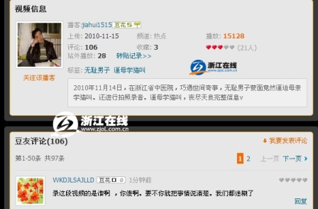 正當(dāng)網(wǎng)友為此而感動(dòng)時(shí),一個(gè)《無(wú)恥男子逼母學(xué)貓叫》的視頻也在網(wǎng)上流傳,視頻中一位蒙面男子在醫(yī)院“逼”一位母親當(dāng)眾學(xué)貓叫,引來(lái)罵聲一片。這其中,既有人罵“逼”者不人道,又有人贊母親之偉大,稱是“慈母貓叫”、現(xiàn)代版的“鹿乳奉親”。視頻中的母親,正是當(dāng)眾學(xué)唱《春天里》的董觀榮,一位已經(jīng)49歲的媽媽。