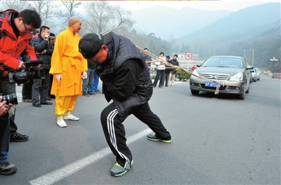 昨天上午9點多,在潭柘寺前的空地上,早早聚集了數(shù)十名熱心的游客以及媒體人員。“快看,慧龍師父出來熱身了,聽說要拉著6輛車走。”一名游客向周圍的朋友介紹說。