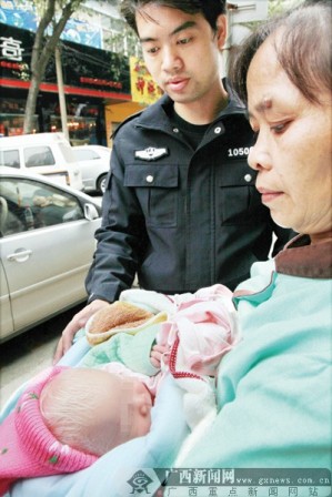 “小孩是父母的心骨肉,真不知道他的父母怎么舍得下心來拋棄他?”韋阿姨抱著男嬰告訴記者,通過小孩的哭聲,小孩應該很健康,唯一顯得有點另類的就是小孩的“發色”。 該派出所負責人表示,在找不到小孩親人的情況下,他們將按程序將男嬰及隨身攜帶的財物一起移送南寧市社會福利院。目前,派出所正在做進一步調查。 (記者 曹哲虎 徐天保)