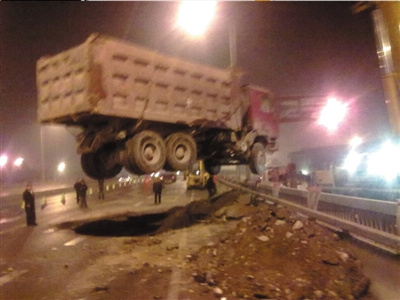 司機劉先生稱:“當時我開車行駛在最外側車道,路非常平坦,不知為何前面的大貨車顛簸了一下,我趕緊左打輪,但還沒反應過來,我的車后輪就‘咕咚’一下陷進去了。”他趕緊抓住車棚上的一個部位,車體下陷時,他“吊”在車駕駛室內。“幸虧我反應快,不然頭就撞車門上了。”他下車后發現,貨車陷在了約兩米深的大坑里。坑南側有一條十幾米長的裂縫,他怕會再次發生坍塌,于是迅速在車后放上路障并打電話報警。