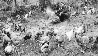 在江西宜春市一養殖場,工作人員正在給土雞喂食天然食料。鄒海斌攝(人民圖片)