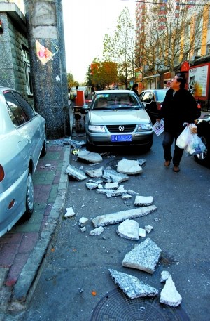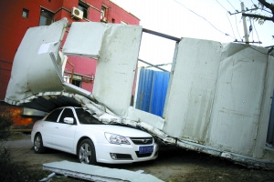 昨日,西三旗一處地鐵工地的一簡易房被大風吹到隔壁小區砸中一輛車。當日,北京刮起8級大風。記者 浦峰 攝