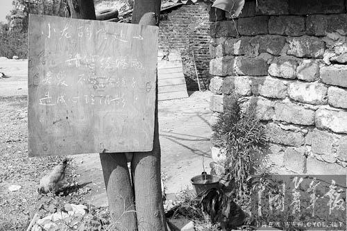 在通往阿龍家路旁的小樹上,好心的村民掛上一塊提示牌,提醒關注阿龍的熱心人不要過分打擾孩子的生活,以免給其心理造成影響。(記者 謝洋攝)