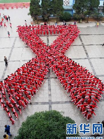 11月30日,江西省德興市銅礦第二小學的學生組成特大“紅絲帶”。當日,江西省德興市銅礦第二小學的學生組成高30米、寬20米的特大“紅絲帶”,迎接12月1日“世界艾滋病日”的到來,表達他們對艾滋病患者的關愛。新華社發(卓忠偉 攝)