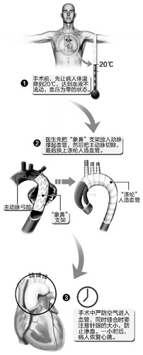 心臟停跳,全身被“速凍”至20攝氏度……無影燈下生死時速,外科醫生爭分奪秒,以最快的速度打開病人胸腔,快速切掉破損的心臟上端人體最大的血管,植進一種高分子滌綸材料做的替代品……24分鐘補完心臟血管,一小時后,患者成功恢復心跳。