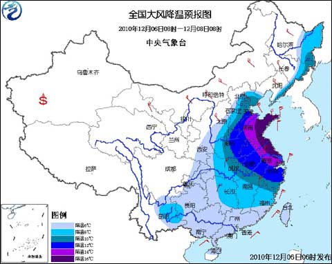 中央氣象臺(tái)2010年12月6日06時(shí)繼續(xù)發(fā)布寒潮藍(lán)色預(yù)警:預(yù)計(jì),12月6日08時(shí)至8日08時(shí),陜西東南部、華北中南部和東部、東北東部、黃淮、江淮、江漢、江南、華南及貴州、云南東部、重慶等地將出現(xiàn)6~10℃降溫,其中,華北東南部、黃淮、江淮、江南東北部等地的部分地區(qū)降溫幅度可達(dá)12~16℃;淮河以北大部地區(qū)有5~6級(jí)偏北風(fēng),江淮、江南有4~5級(jí)偏北風(fēng)。