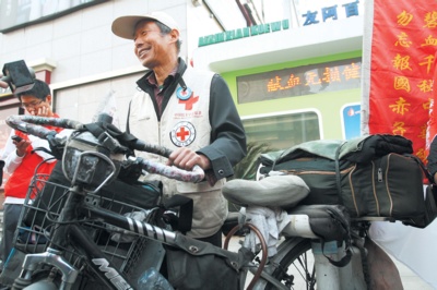 記者昨日看到,高永華的自行車可謂全副武裝:不僅水壺、行李、修車設(shè)備等一應(yīng)俱全,還特別攜帶了無償獻血的宣傳資料。
