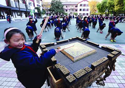 曾經因競拍奧運缶,并因此而獲贈兩只,全國唯一以“夫子”命名的南京夫子廟小學,一時間成為焦點。昨天下午,由該校全國首創的擊缶操,在配套自創的擊缶音樂背景下,在夫小的操場展示。記者看到,這套擊缶操既有富有動感的單人擊缶動作,也有類似交誼舞的團體配合,令人眼前一亮。