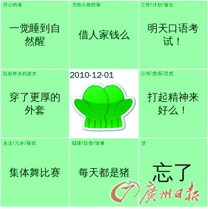 上學的時候,寫日記是很多人都覺得挺麻煩的一件事,“每天都在學校,有什么值得記的呢?”近來,一種叫“九宮格日記”的小玩意卻讓這些年輕人又恢復了寫日記的習慣。在網上搜索,很容易就能找到提供這種服務的網站。經過注冊后,就可以開始寫日記啦!不過,這個“日記本”可有點特別,是一個被分成了九個小方格的一個大方塊,每一個小方格上都寫明了這一格的主題,比如“開心的事情”、“今天比昨天的進步”、“心情感悟”等等。當完成了全部九個格后,一篇“九宮格日記”就大功告成了。