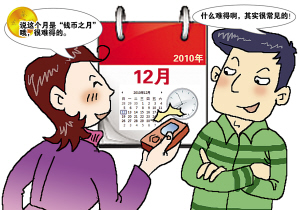 任意一月中出現5次星期三、星期四、星期五,就更常見了。吳志倫說,任意一月出現這樣的情況是在2009年7月,下一次是在2012年8月。他推算了2000年至2050年之間,這樣的“錢幣之月”多達51次。