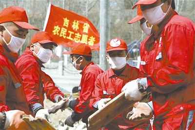 2010年4月,在玉樹地震災區,十多位來自吉林的農民工組成志愿者服務隊,幫助受災群眾重建家園。記者楊登峰攝