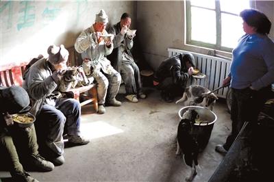 兩條狗時(shí)不時(shí)舔著大鋁鍋里的面條