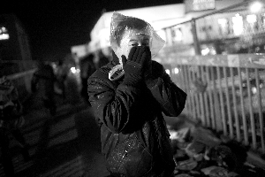 昨日,天橋上,一男子戴著塑料袋擋風。本報記者 王嘉寧 攝