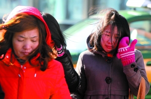 因低溫,王府井等多處旅游點客流量降低。前天,王府井附近的游客在寒風中行走。本報記者 周曉東 攝