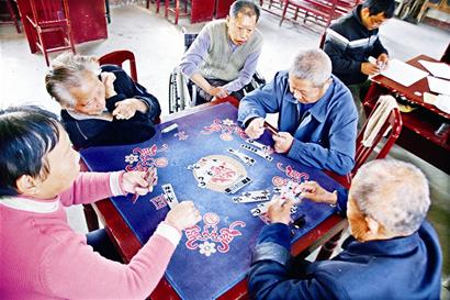 一間屋子門(mén)口,幾位老人正在聊天,另一間屋子里,幾位老人在打紙牌。