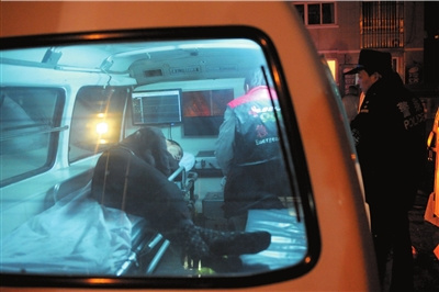 消防員從起火房屋內救出一名男子,將其送進急救車中。記者看到,該男子躺在車中,抱著雙臂瑟瑟發抖,不時向急救人員手持的袋子內嘔吐。