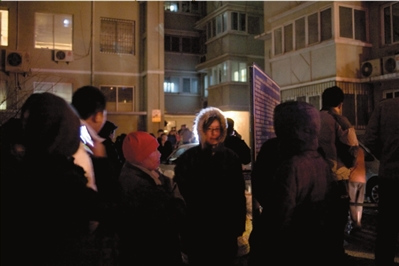 樓內住戶被疏散后在小區里頂著寒風等待回家