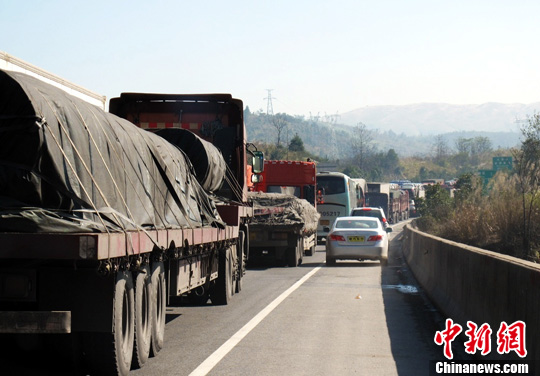 因強冷空氣降雪結冰給交通帶來嚴重影響,北方貨運車輛無法南下,京港澳高速公路粵北段冰封受阻后,大量南下貨車只得滯留在湖南境內等待高速公路解封。17日下午,南北交通全面恢復,得到信息的南下貨車匆匆蜂擁而下,給剛剛恢復通行能力的道路帶來新的擁堵,先后多處出現長達十余公里的車龍。