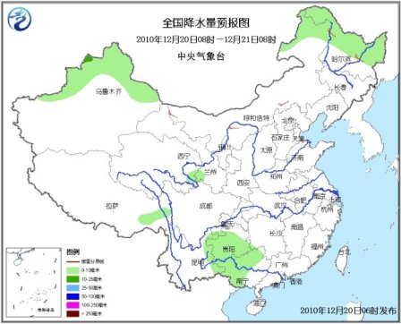 20日08時至21日08時,新疆北部、西藏東南部、青海東南部、內蒙古東北部、黑龍江中北部等地的部分地區有小到中雪或陣雪,其中,新疆西北部的局地有大到暴雪;四川東南部、貴州大部、云南東部、廣西中西部和北部等地有小雨或陣雨。內蒙古大部、東北地區北部等地有4~6級風。渤海、黃海北部和中部海域將有4~5級西南風;臺灣海峽、臺灣以南海域、南海大部海域將有5~6級東北風。
