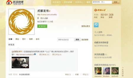 昨日,記者在成都市政府新聞辦的官方微博——“成都發(fā)布”看到,微博開通僅半年時間,已吸引到超過5萬名粉絲圍觀。據(jù)了解,這樣的粉絲數(shù)量在內地59個政府官方微博中位居第一,僅次于香港政府微博。
