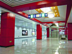 望京西站內,方立柱、仿古宮燈等色彩為純正的“中國紅”,頂部裝修借鑒了中國古建的藻井形式。