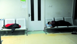 “得等四天才能做上檢查,還不知道住哪兒呢?”在醫院二層樓道盡頭的角落里,從保定來的趙德江正蹲在墻角喝水,在身邊的長椅上,患病的孩子由媽媽和姥姥在照顧,一個裝著他們全部家當的牛仔旅行包放在地上。趙德江告訴記者,他兩個月大的女兒眼睛總是不自然地四處轉動,在當地醫院做了全面檢查后,醫生懷疑與腦神經有關,建議他帶著孩子“去北京找專家”!皺z查預約在下周二,外面最便宜的住一晚上也80元,這還沒看上病呢,仨大人就得花不少錢!庇谑勤w德江琢磨著,先在醫院里待著,“等有人轟的時候再想辦法!庇浾呖吹,像趙德江這樣為省下錢給孩子看病而拖家帶口在醫院樓道內打游擊的家長并不在少數。