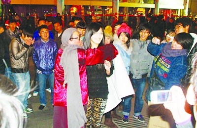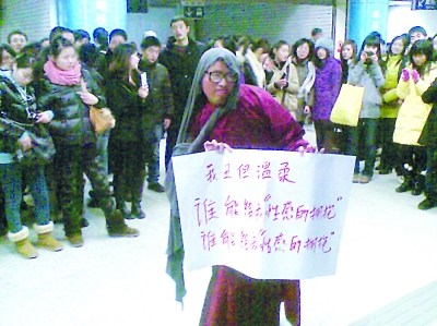 圣誕節的夜晚,南京街頭人頭攢動,而在新街口地下通道更是出現了火爆一幕,讓人驚叫連連。原來,一個打扮怪異,手舉“我丑但溫柔,誰能給我性感的擁抱”的大紙牌的中年男子,正在旁若無人的擺出各種造型。