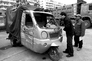 28日,墜河事故中由農用三輪改裝成的“校車”。郭國權 攝