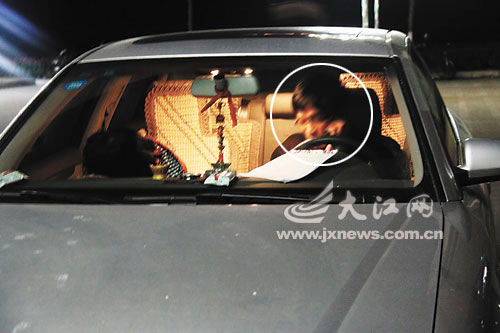 昨日傍晚6時20分許,記者來到華東交大北門校區內,只見一輛奧迪A4小車停在大門旁,駕駛位上一名男子邊抽煙邊打著電話,副駕駛位上的女學生則趴著,遮住了臉。