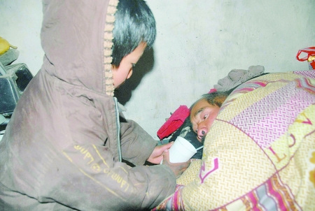 6歲的小福源每天都要給父親喂飯喂水