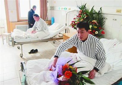 圖二:1月5日,在堵截持槍歹徒戰(zhàn)斗中負傷的泰安市交警支隊直屬一大隊副隊長劉峰(右)和中隊長趙偉在醫(yī)院治療。 (新華社記者 朱崢 攝)