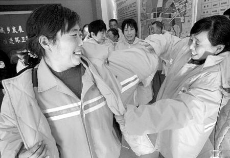 2009年冬季,武漢硚口區(qū)城管局為1300多名一線環(huán)衛(wèi)工人換發(fā)的新式工作服為中長式羽絨服,長到膝蓋,帶連衣帽,有毛領(lǐng);有可拆卸式內(nèi)膽,膽內(nèi)為高含量羽絨,面料為防雨布,可遮風(fēng)擋雨。一線環(huán)衛(wèi)工普遍反映,新工作服暖和多了。原來就一單衣或馬甲,大家都是里三層外三層地套毛衣后再罩馬甲,穿得很笨重,干起活來都不方便。現(xiàn)在就穿一件毛衣套上新的羽絨服,輕便多了,不僅擋風(fēng)御寒,干起活來也利索。