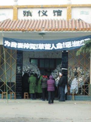 “沒有的事,我們從來就沒接受這一說法。”李莉生前的一名鄰居搖頭對記者說。他指著殯儀館門口懸掛的寫有“草菅人命,懲治兇手”等黑色大字的白色橫幅介紹說:“我們在殯儀館住了三四天了,就是希望能夠有一個公道的說法,希望能夠懲治兇手,告慰死者。”