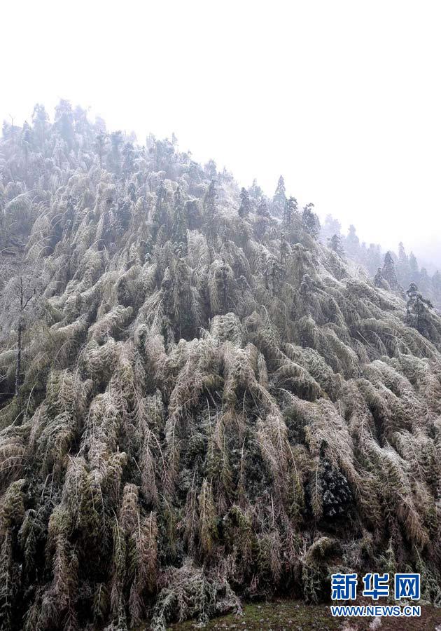 在廣西灌陽縣西山瑤族鄉的一座山上,成片的毛竹結冰倒伏,部分已開始斷裂(1月8日 陳瑞華 攝)。