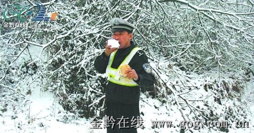 在網(wǎng)上一組專題報(bào)道中,標(biāo)題為《貴州遵義交警抗凝凍,啃雪堅(jiān)守崗位》的系列照片,引起了網(wǎng)民關(guān)注。其中有交警在道路上設(shè)卡值勤,也有交警幫過(guò)往司機(jī)推車的情景,而一張交警“啃雪”吃面包的照片,尤其讓人印象深刻,至今已有1108條評(píng)論。記者注意到,照片中的交警臉被凍得通紅,他左手拿著面包,右手拿著一團(tuán)雪,正放在嘴里啃。