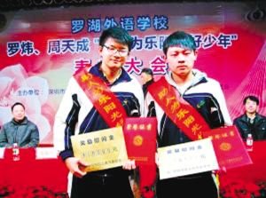 12日,深圳的天氣異常寒冷,但是在羅煒、周天成“助人為樂陽光好少年”表彰大會上,卻春意融融。當市見義勇為基金會宣布給兩個見義勇為的少年每人頒發1萬元的獎勵慰問金時,許多與會人員情不自禁地發出驚嘆聲。