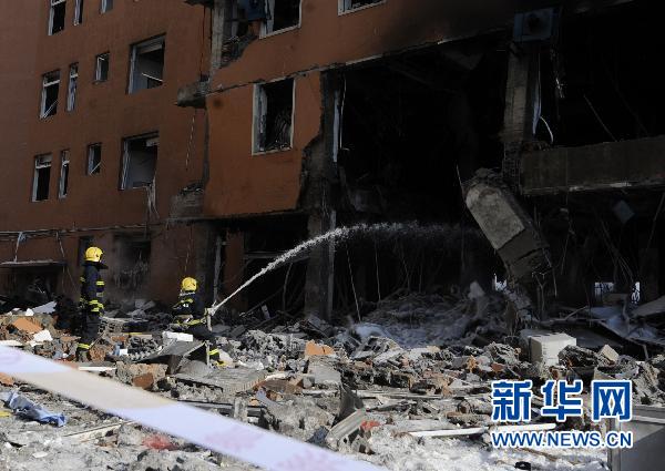1月17日,消防人員在事發現場使用高壓水槍滅火。當日6時5分,吉林市昌邑區一棟樓發生一起天然氣爆炸事件,目前已經造成3人死亡,20多人入院治療。據現場一位吉林市民介紹,爆炸現場的明火已經基本被撲滅。事故原因正在調查中。新華社記者林宏攝